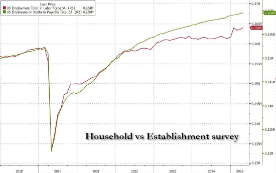 由于家庭调查中就业人数大幅增加,4月家庭调查与机构调查之间的差距进一步缩小。
