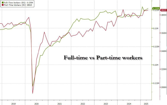 从劳动力市场的质量构成来看,4月全职员工人数增加了30.5万,而兼职员工人数增加了5.6万,这是人们期待已久的全职(非非法移民)劳动力占主导的情况回归。
